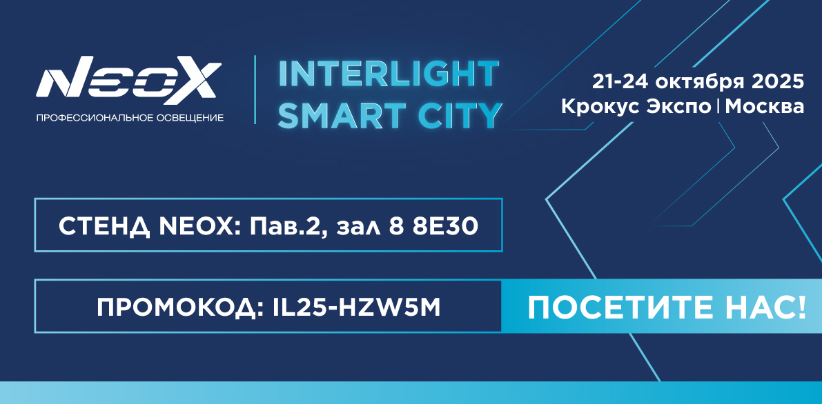 IL25-HZW5M и приходите за эффективными светотехническими решениями для вашего объекта. Компания ООО «ИН ХОУМ» (ТМ Neox) приглашает на Interlight 21–24 октября 2025 в МВЦ «Крокус Экспо». В 2025 году выставке Interlight исполняется 30 лет. На нашем стенде — только продукция бренда Neox: демонстрации, технические консультации и подбор световых решений для промышленных и складских объектов.