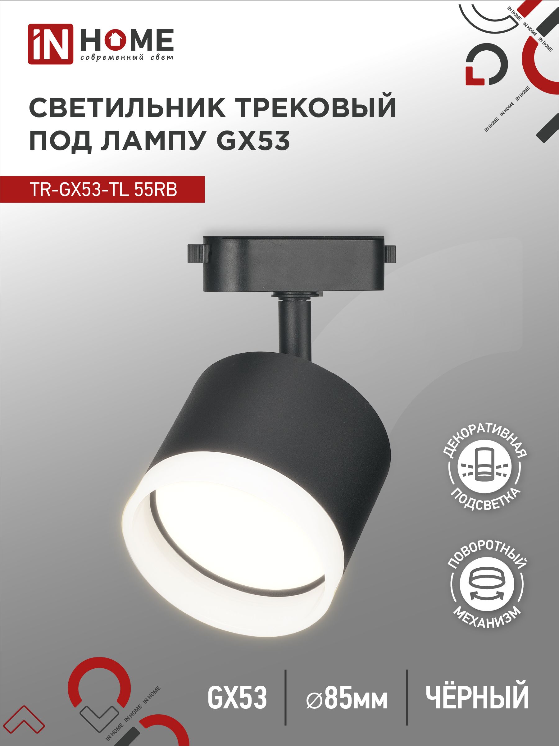 Светильник трековый TR-GX53-TL 55RB-ER под лампу GX53 с подсветкой черный IN HOME