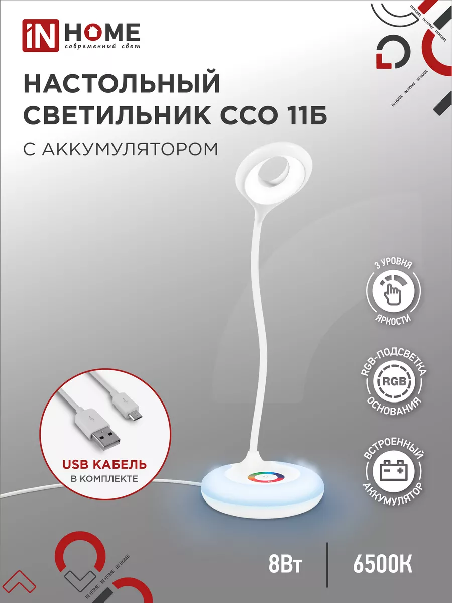 Светильник настольный светодиодный аккумуляторный ССО 11Б 8Вт 6500К 640Лм RGB-подсветка, сенсор-диммер, USB-кабель БЕЛЫЙ IN HOME