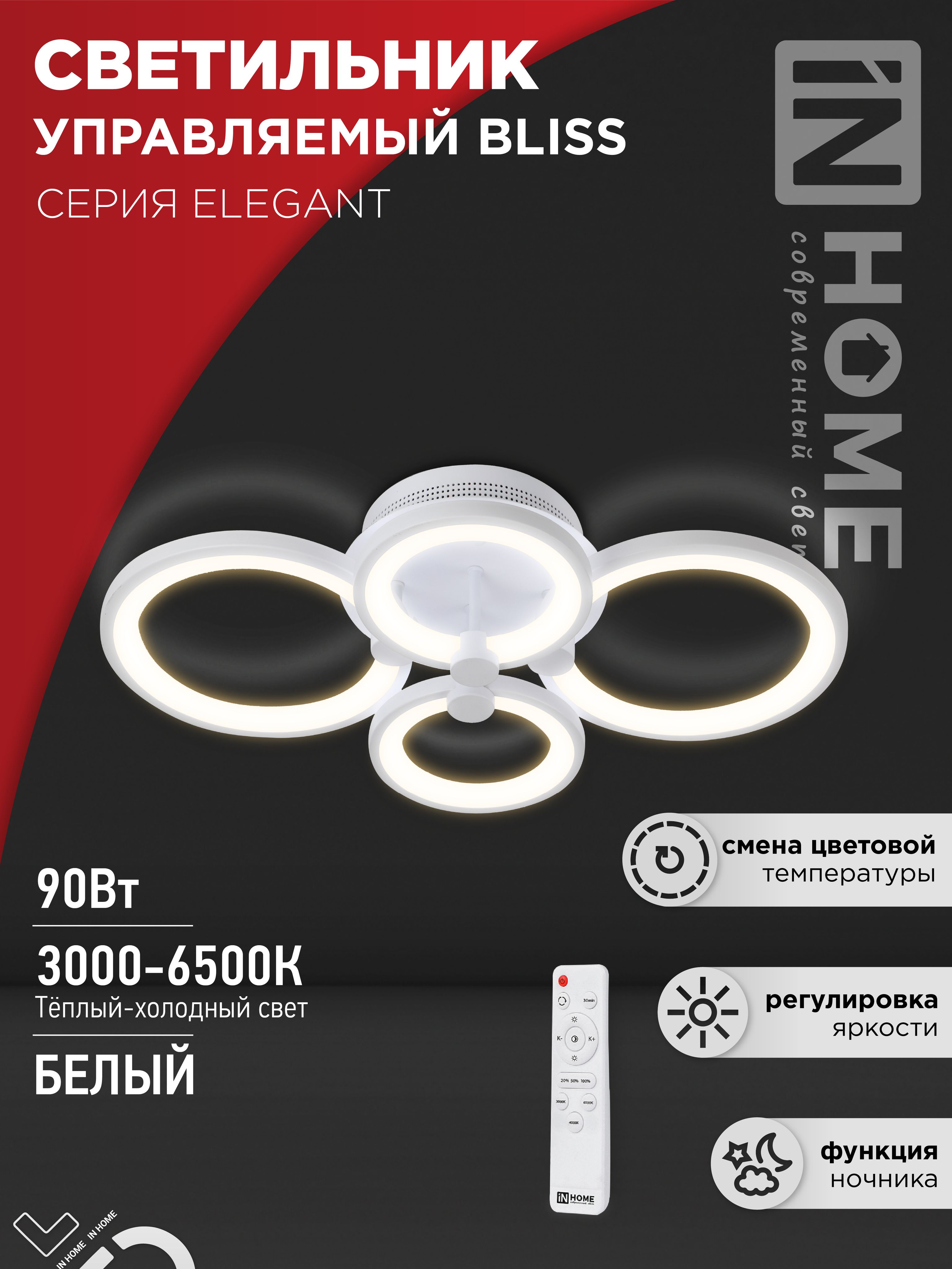 Светильник светодиодный ELEGANT BLISS-W 90Вт 230В 3000-6500K 610х400х130мм c пультом ДУ белый IN HOME