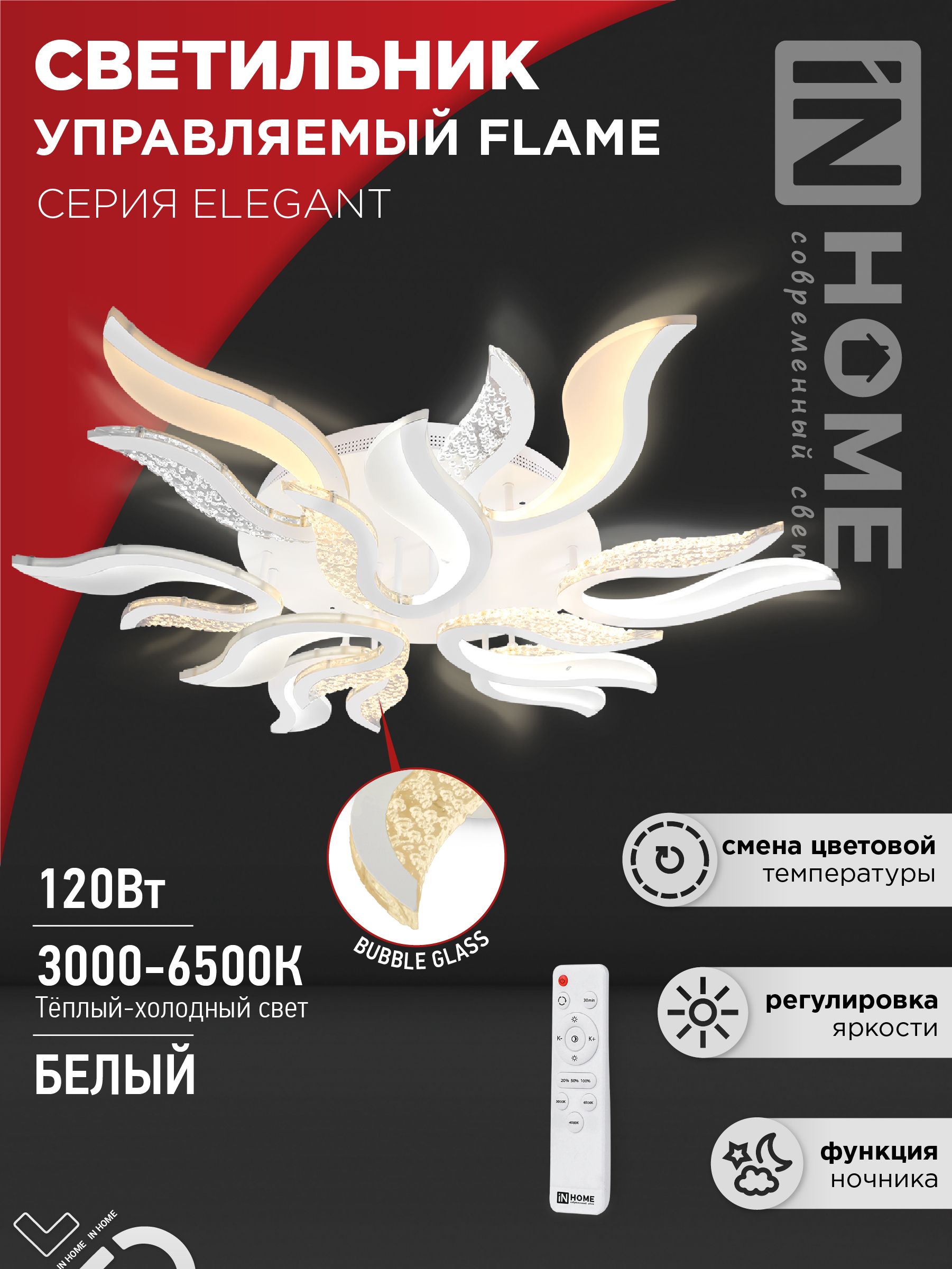Светильник светодиодный ELEGANT FLAME 120Вт 230В 3000-6500K 1035х895х120мм c пультом ДУ белый IN HOME