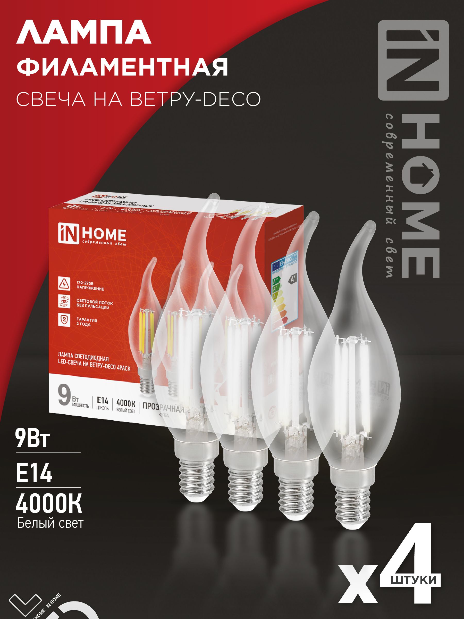 Лампа светодиодная LED-СВЕЧА НА ВЕТРУ-deco 4PACK 9Вт 230В Е14 4000К 1040Лм (4шт./упак) прозрачная IN HOME